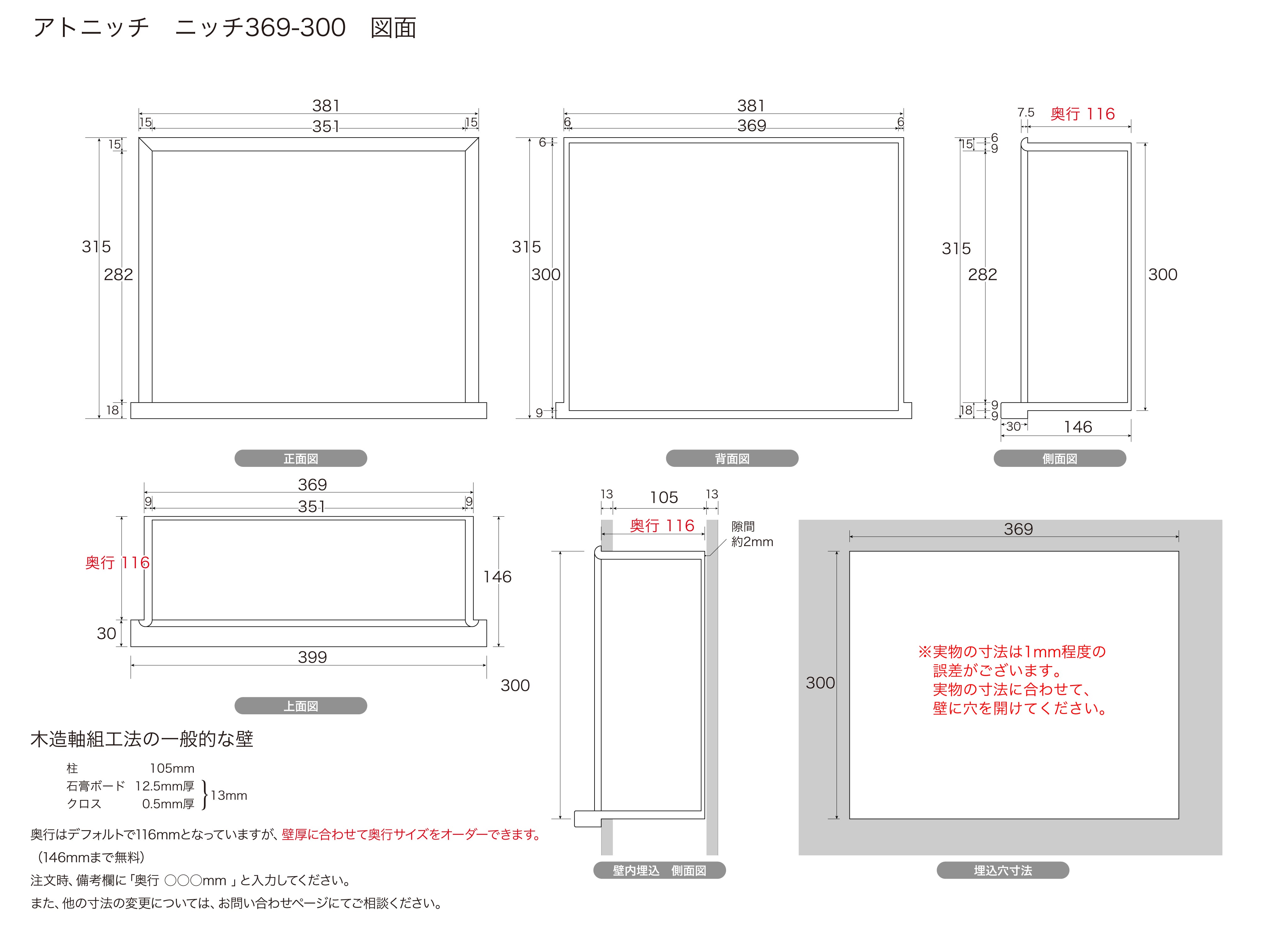 ※本体外寸奥行は、標準的な木造軸組工法の住宅、柱105mm角、石膏ボード厚12.5mm、壁クロス0.5mmの壁厚に合わせた116mmがデフォルトですが、壁厚に合わせてオーダーできます(146mmまで無料)。注文時、備考欄に「奥行○○○mmに変更」と寸法を明記してください。