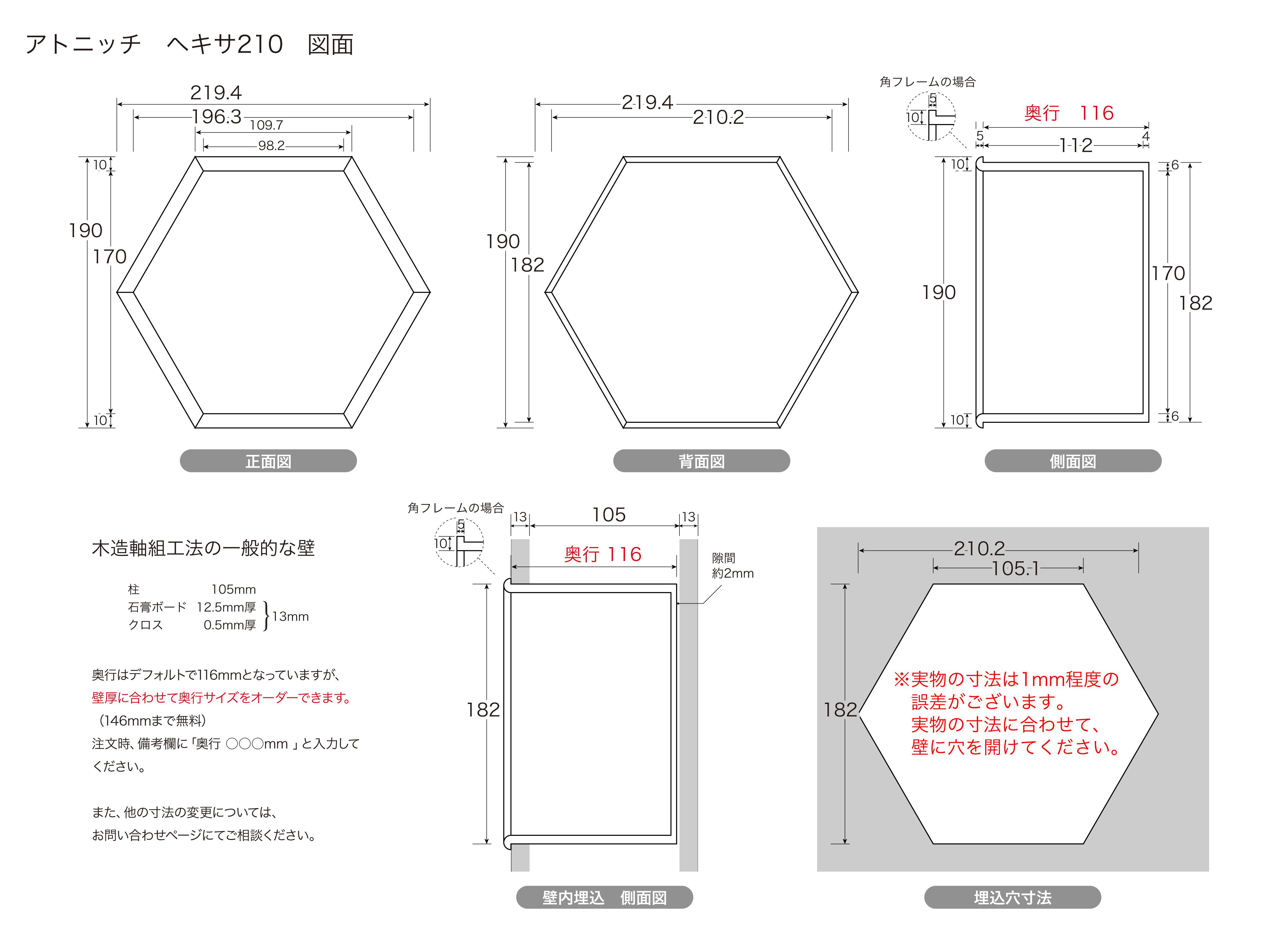 ※本体外寸奥行は、標準的な木造軸組工法の住宅、柱105mm角、石膏ボード厚12.5mm、壁クロス0.5mmの壁厚に合わせた116mmがデフォルトですが、壁厚に合わせてオーダーできます(146mmまで無料)。注文時、備考欄に「奥行○○○mmに変更」と寸法を明記してください。