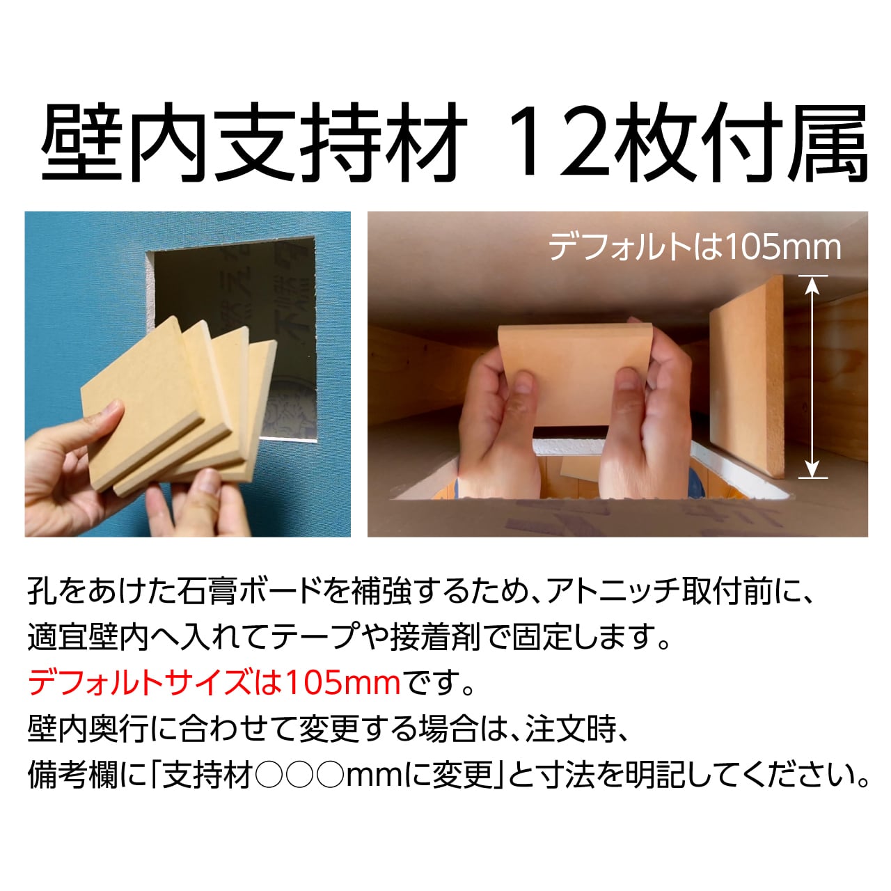 ※本体外寸奥行は、標準的な木造軸組工法の住宅、柱105mm角、石膏ボード厚12.5mm、壁クロス0.5mmの壁厚に合わせた116mmがデフォルトですが、壁厚に合わせてオーダーできます(146mmまで無料)。注文時、備考欄に「奥行○○○mmに変更」と寸法を明記してください。