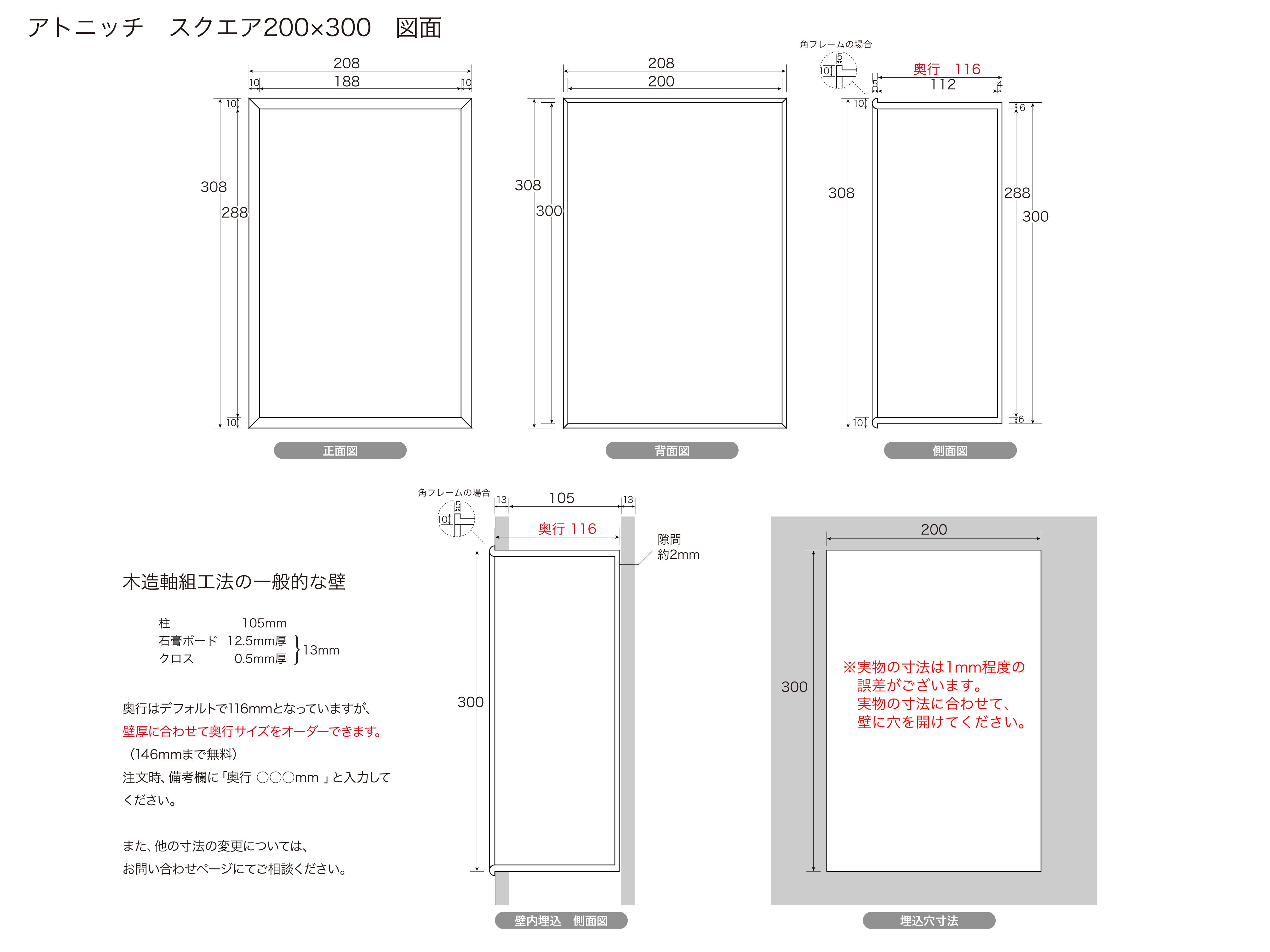 ※本体外寸奥行は、標準的な木造軸組工法の住宅、柱105mm角、石膏ボード厚12.5mm、壁クロス0.5mmの壁厚に合わせた116mmがデフォルトですが、壁厚に合わせてオーダーできます(146mmまで無料)。注文時、備考欄に「奥行○○○mmに変更」と寸法を明記してください。