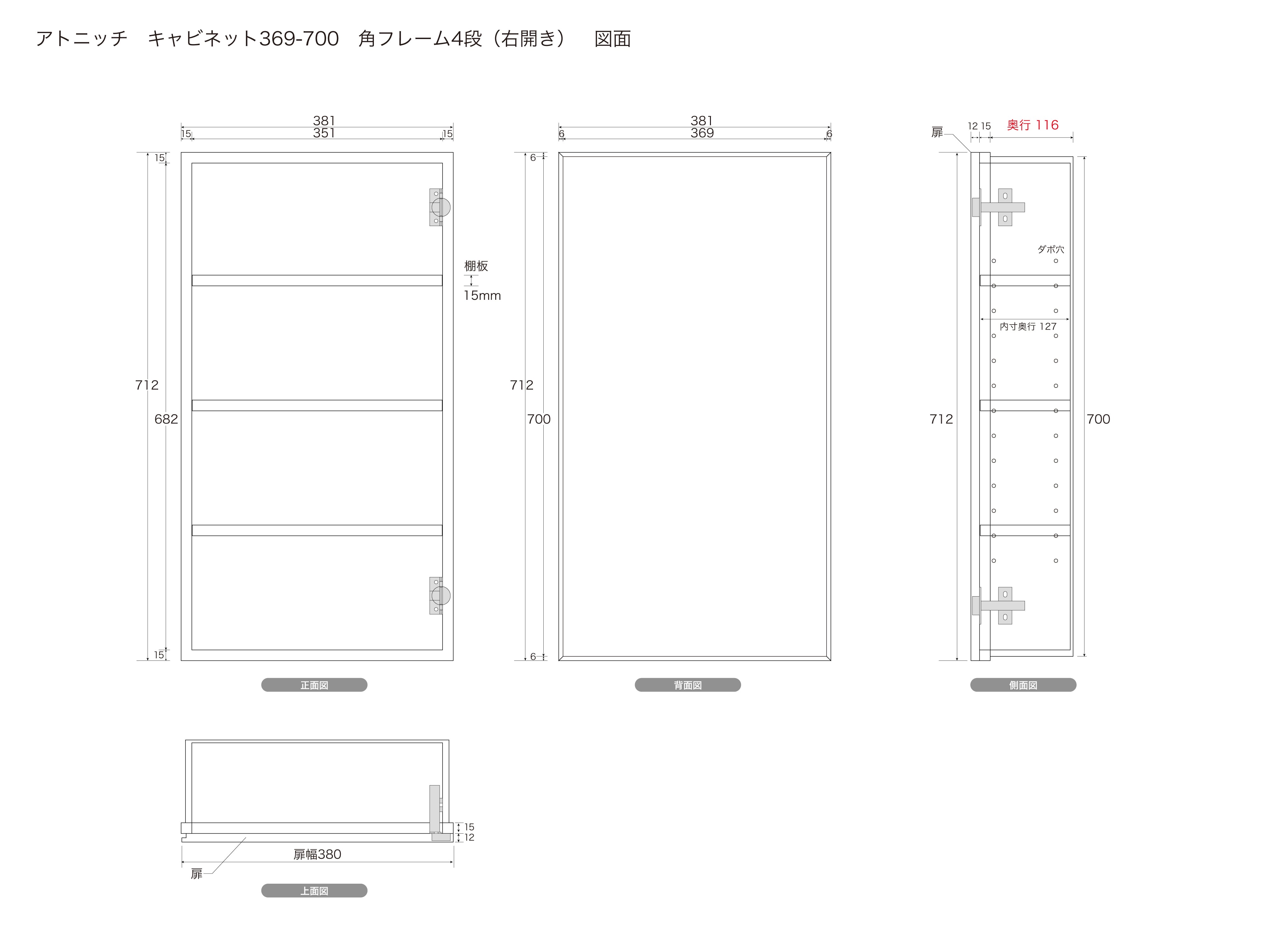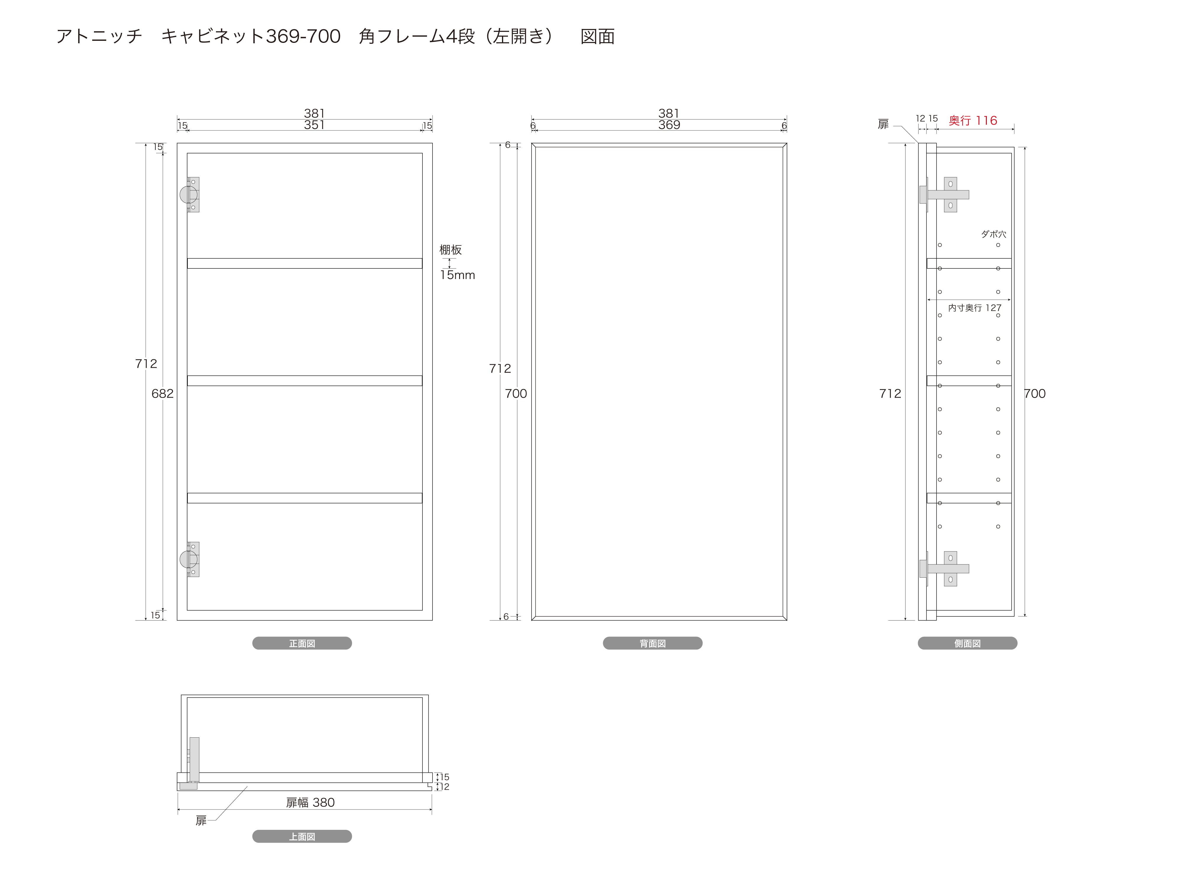 本体外寸法 :W 369mm × H 700mm × D 116mm(+フレーム厚15mm+扉厚12mm)