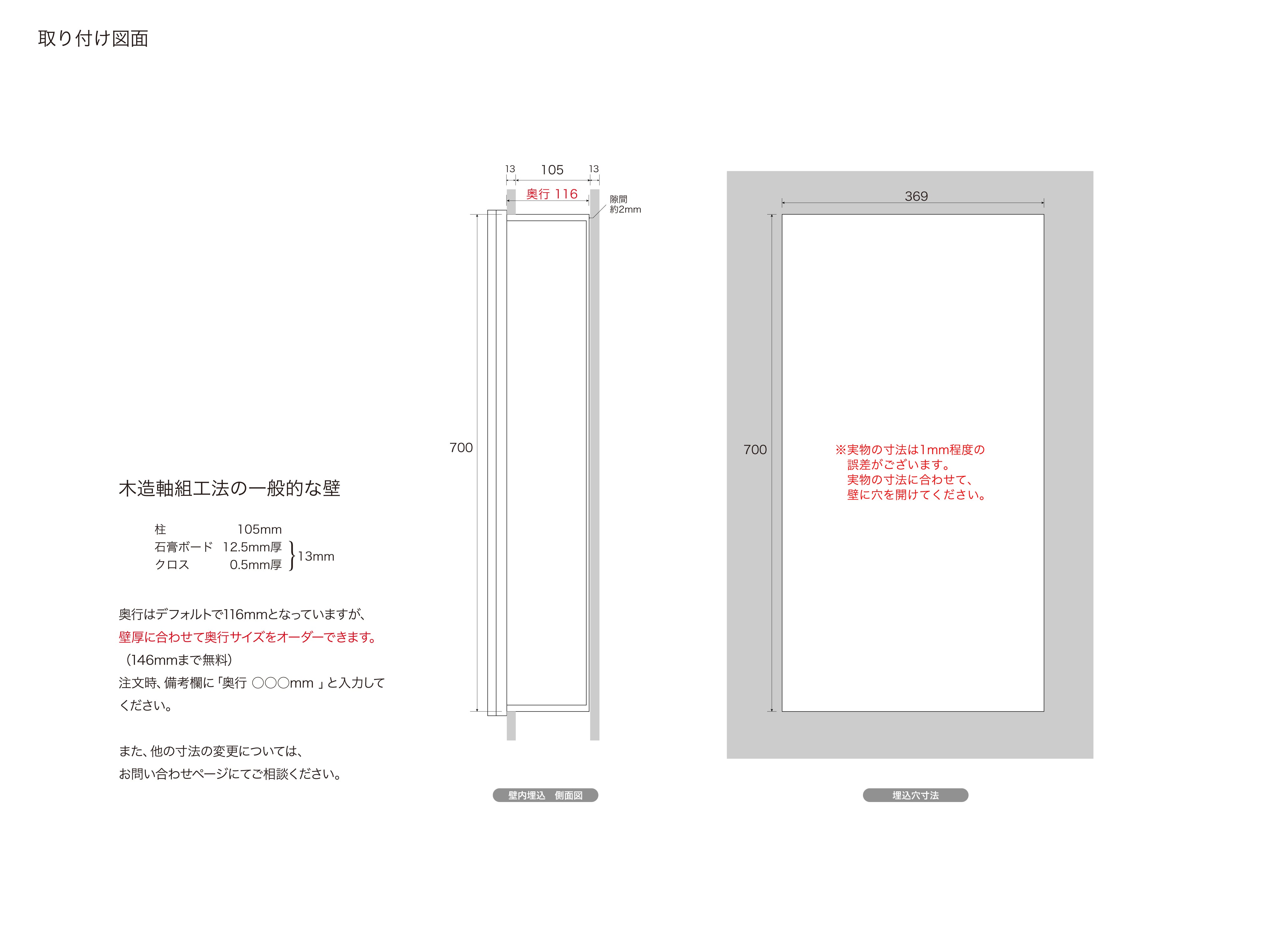 ※本体外寸奥行は、標準的な木造軸組工法の住宅、柱105mm角、石膏ボード厚12.5mm、壁クロス0.5mmの壁厚に合わせた116mmがデフォルトですが、壁厚に合わせてオーダーできます(146mmまで無料)。注文時、備考欄に「奥行○○○mmに変更」と寸法を明記してください。