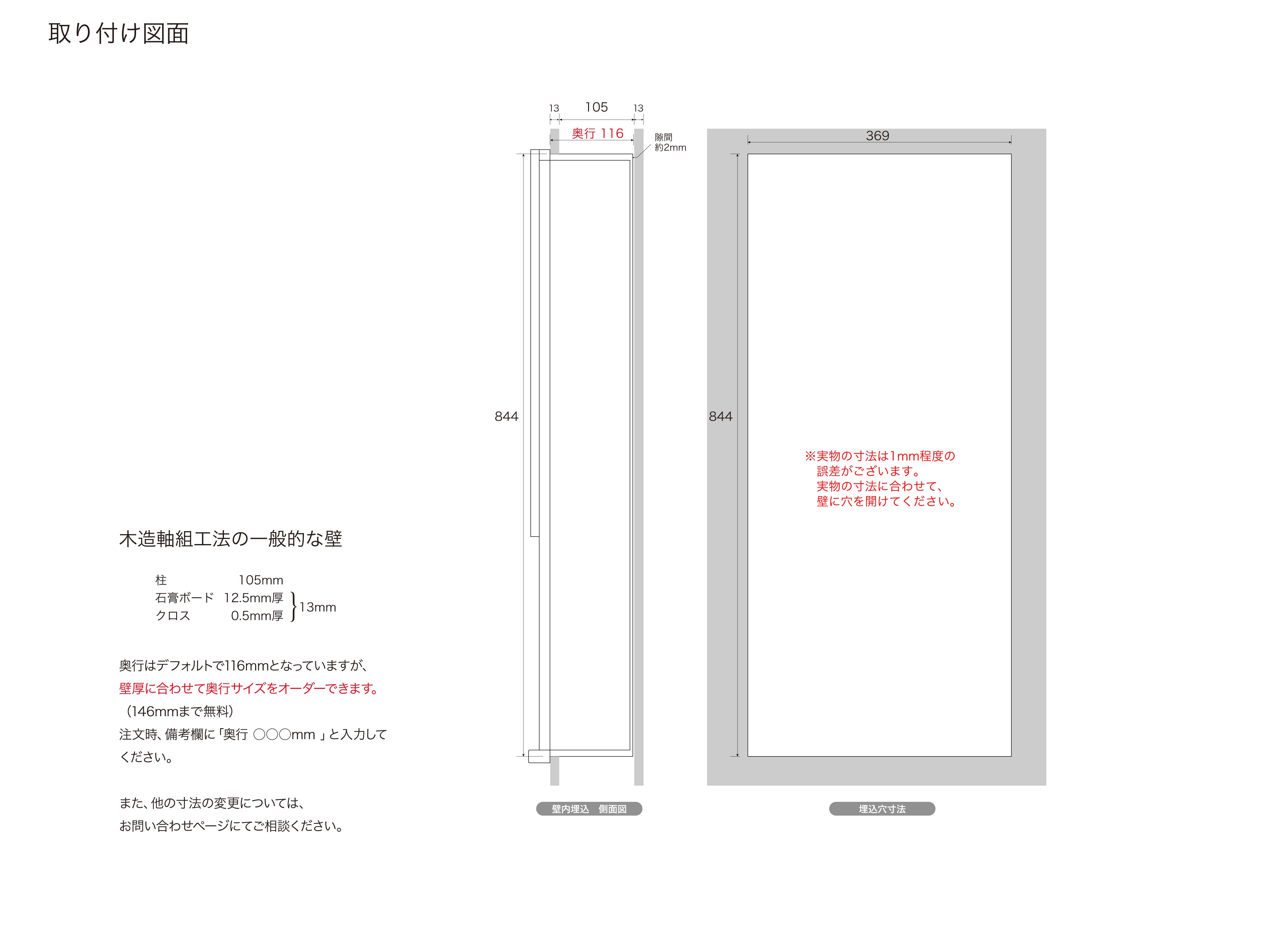 ※本体外寸奥行は、標準的な木造軸組工法の住宅、柱105mm角、石膏ボード厚12.5mm、壁クロス0.5mmの壁厚に合わせた116mmがデフォルトですが、壁厚に合わせてオーダーできます(146mmまで無料)。注文時、備考欄に「奥行○○○mmに変更」と寸法を明記してください。