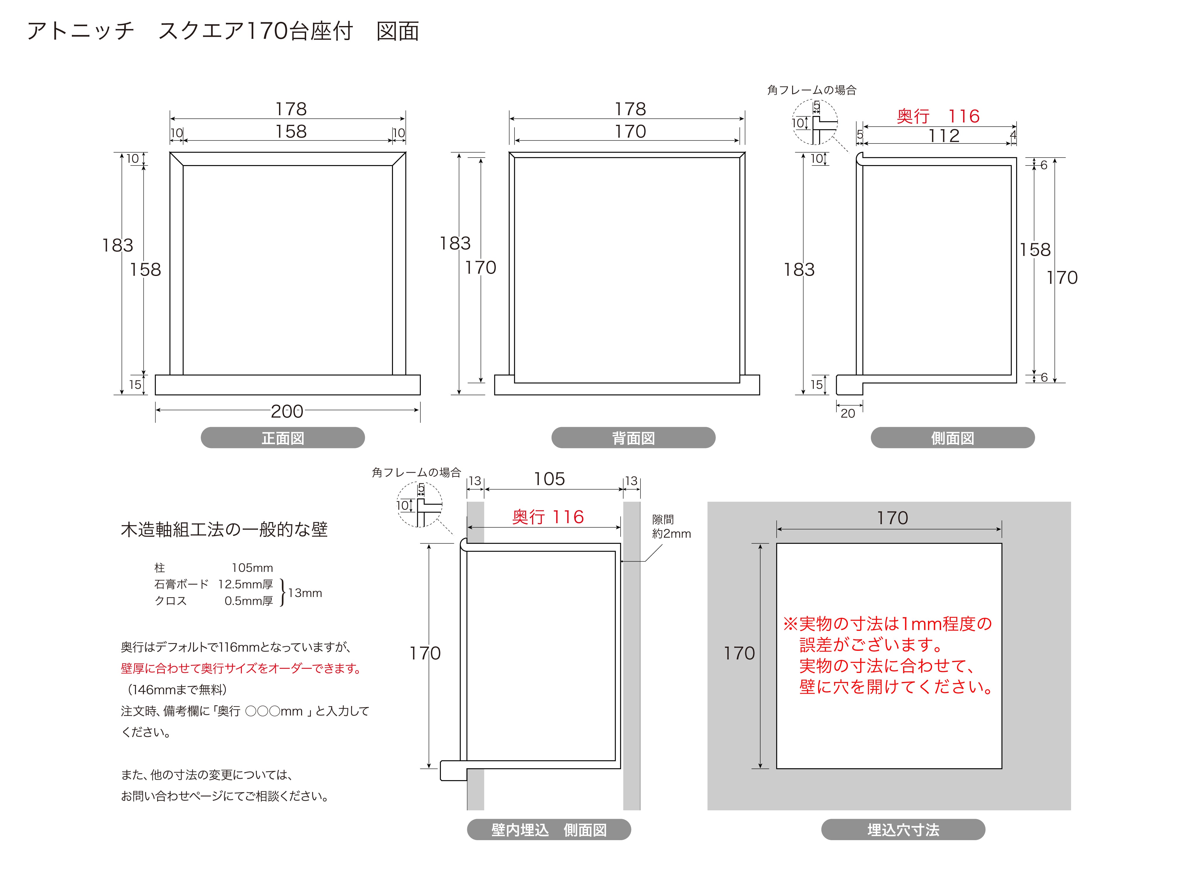 ※本体外寸奥行は、標準的な木造軸組工法の住宅、柱105mm角、石膏ボード厚12.5mm、壁クロス0.5mmの壁厚に合わせた116mmがデフォルトですが、壁厚に合わせてオーダーできます(146mmまで無料)。注文時、備考欄に「奥行○○○mmに変更」と寸法を明記してください。