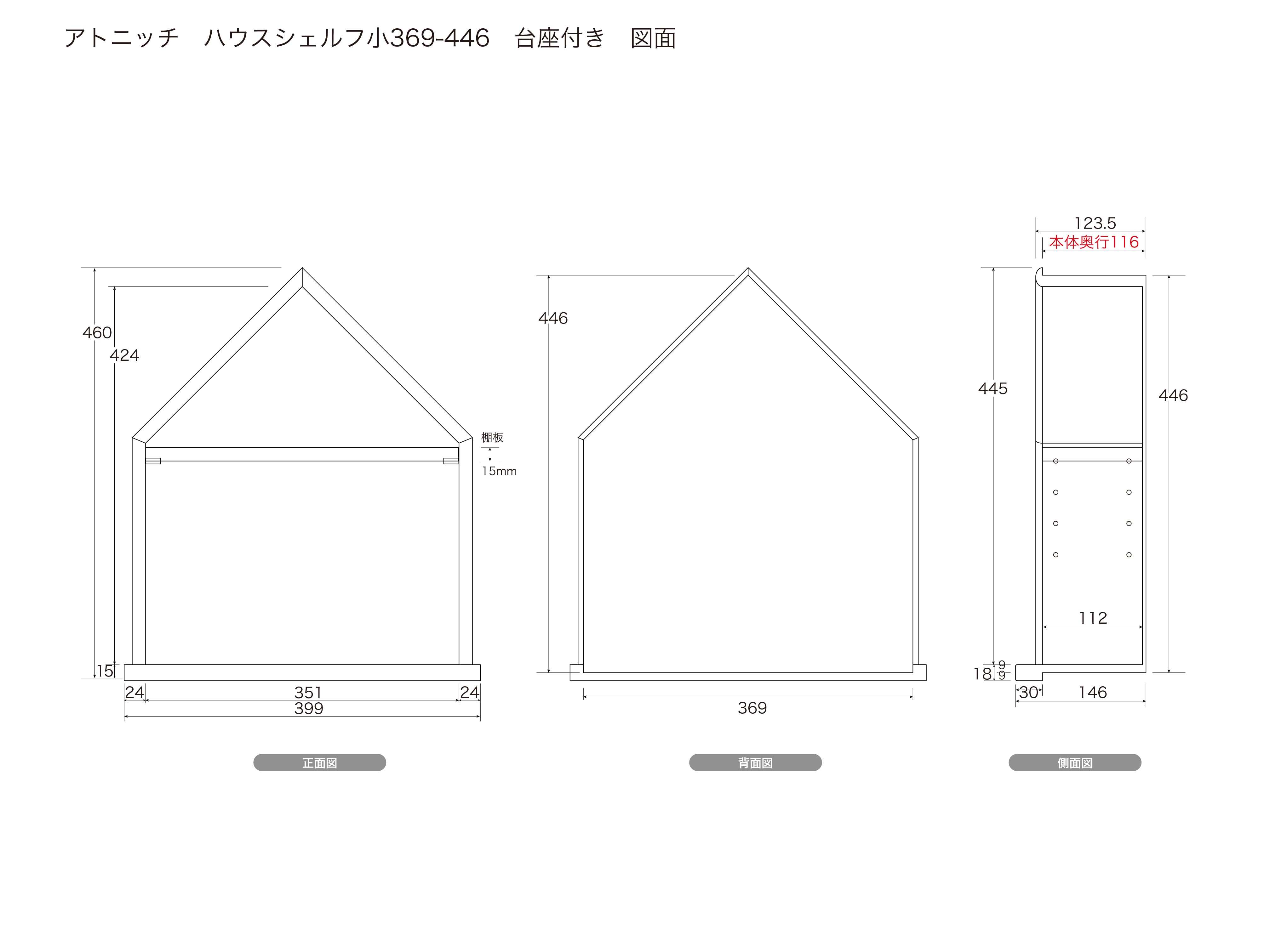 本体幅369mm縦446mmのカウンター付きハウス型シェルフです。