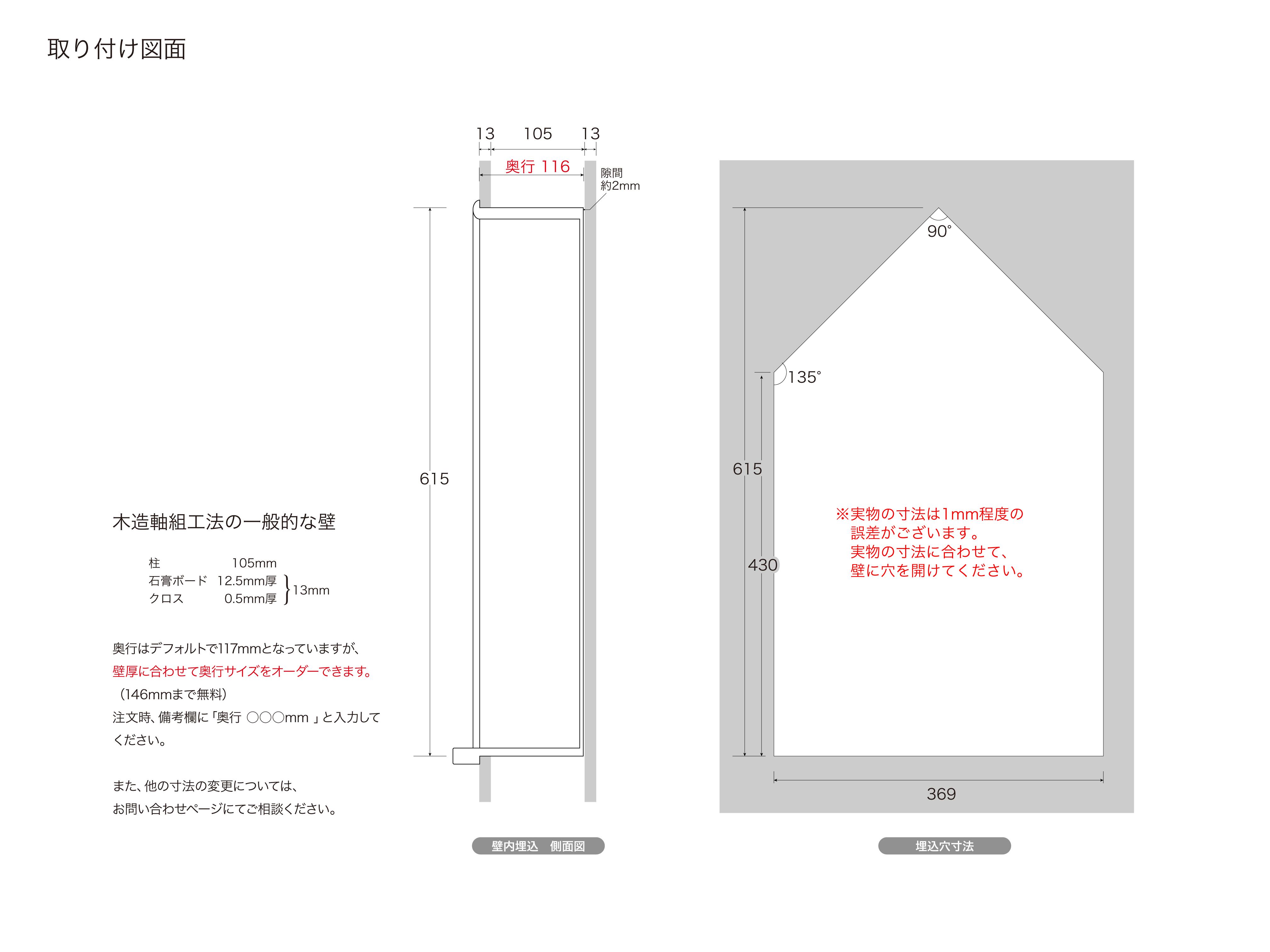 ※本体外寸奥行は、標準的な木造軸組工法の住宅、柱105mm角、石膏ボード厚12.5mm、壁クロス0.5mmの壁厚に合わせた116mmがデフォルトですが、壁厚に合わせてオーダーできます(146mmまで無料)。注文時、備考欄に「奥行○○○mmに変更」と寸法を明記してください。