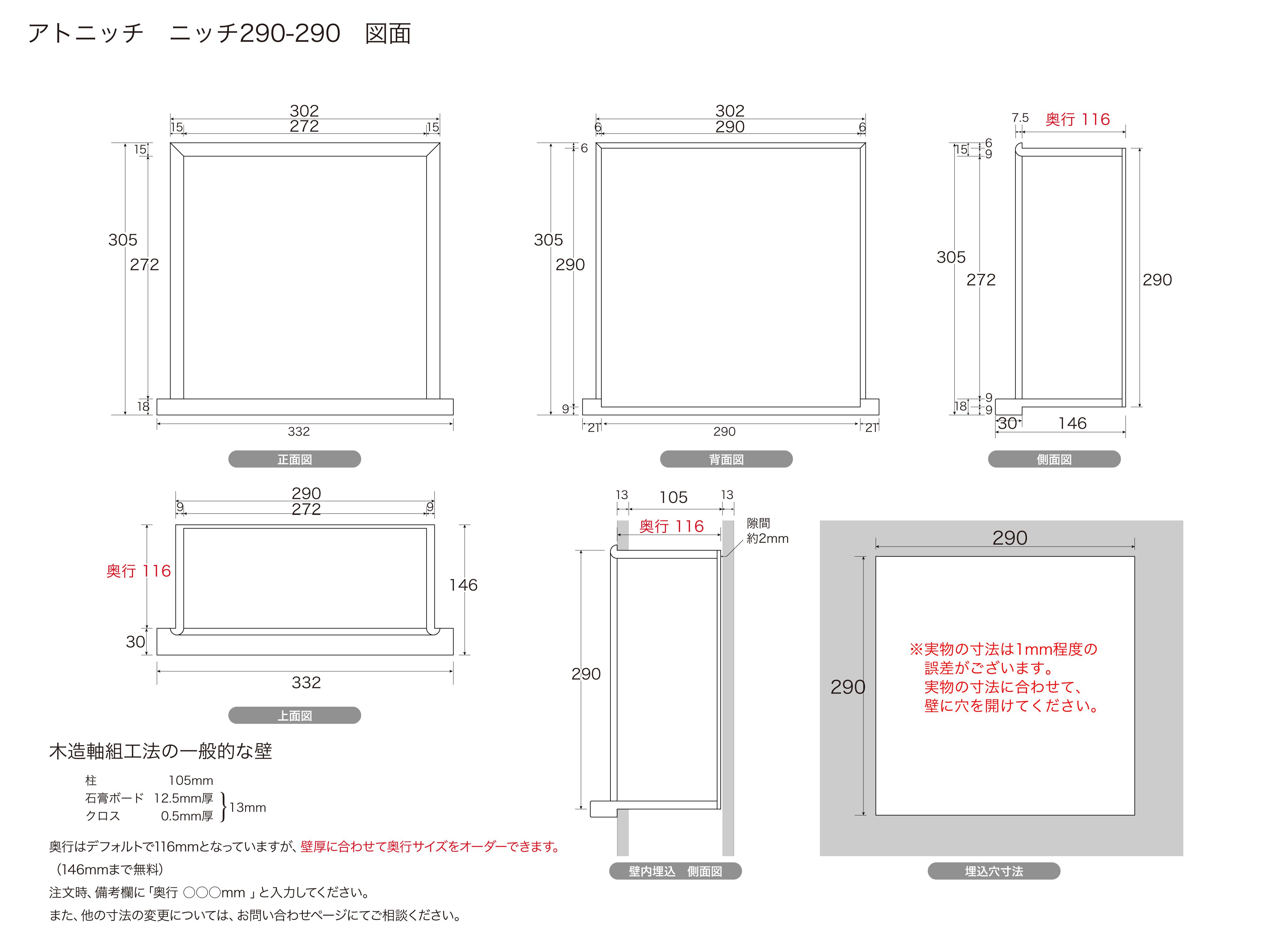 ※本体外寸奥行は、標準的な木造軸組工法の住宅、柱105mm角、石膏ボード厚12.5mm、壁クロス0.5mmの壁厚に合わせた116mmがデフォルトですが、壁厚に合わせてオーダーできます(146mmまで無料)。注文時、備考欄に「奥行○○○mmに変更」と寸法を明記してください。